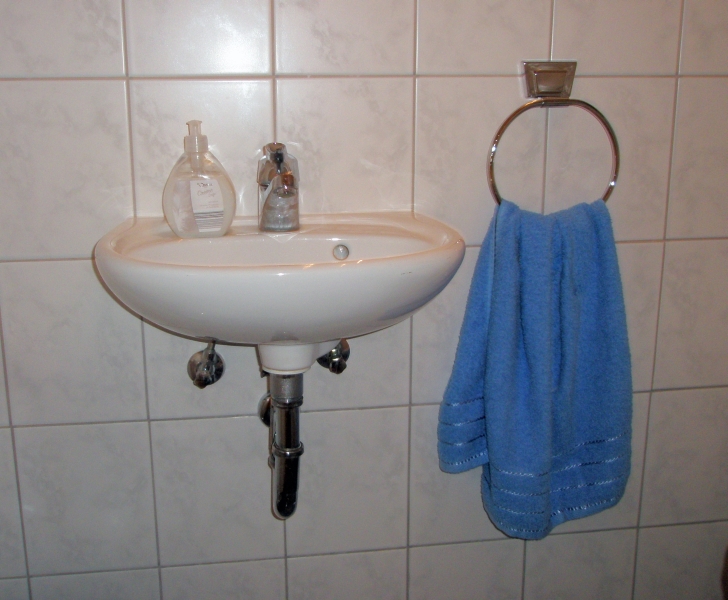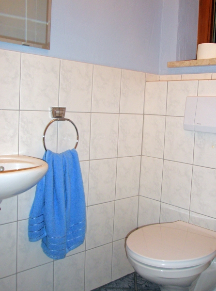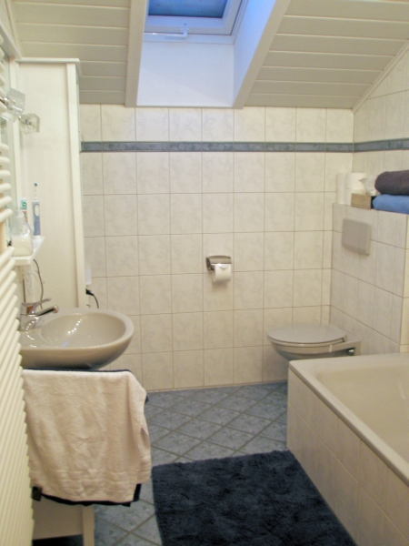 Die rauchblauen Bodenfliesen werden durch die Fußbodenheizung angenehm erwärmt. Sie haben die Wahl zwischen einem Entspannungsbad oder eine erfrischenden Dusche. Die farblich abgestimmten kuscheligen Frottierhandtücher machen das Wohlfühl-Programm perfekt.